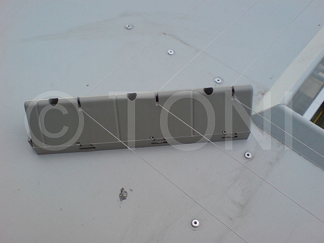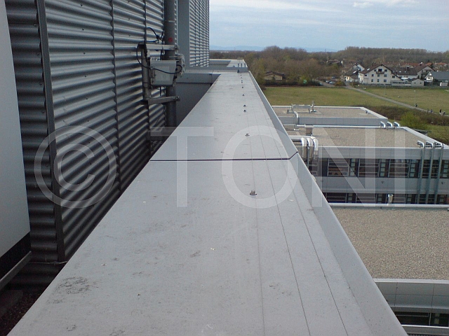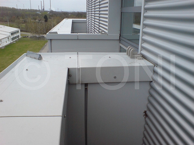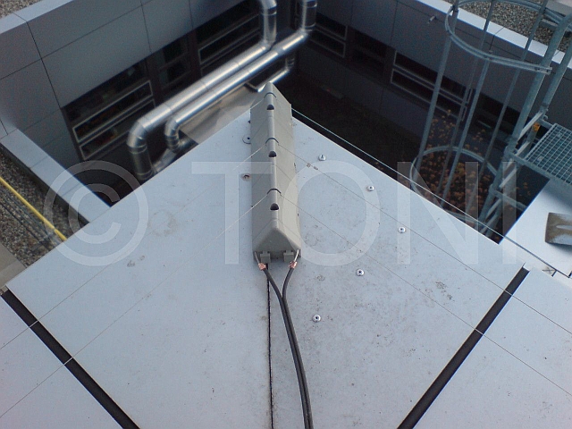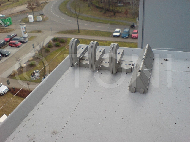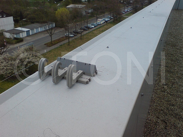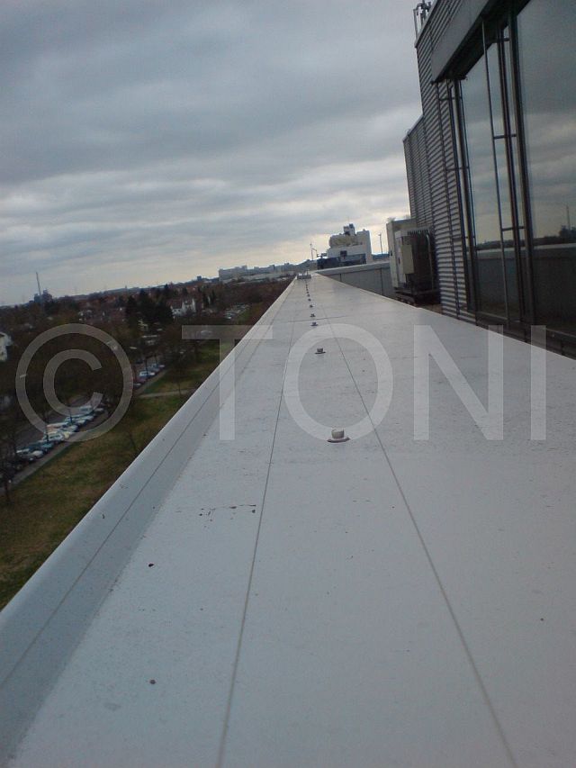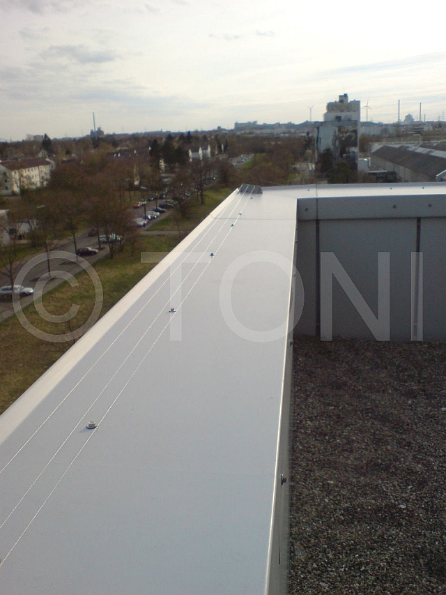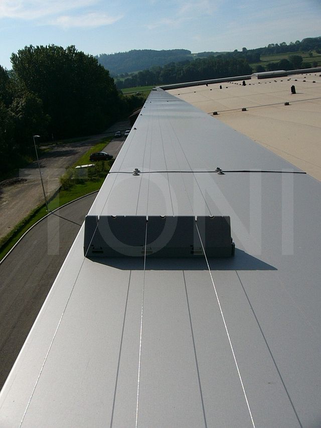 Dazu haben wir mehrere Segmente - jeweils drei Edelstahldrähte - hintereinander montiert und untereinander verbunden. Jedes Segment schützt ca. 18-20 Meter Attika. Umlenkungen bei Kanten werden durch schräg stehende Profile erreicht.