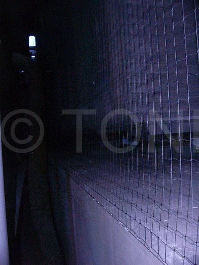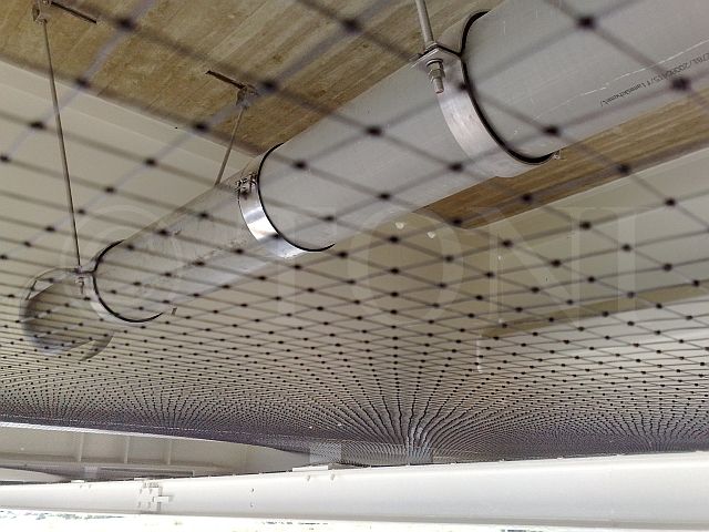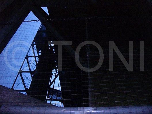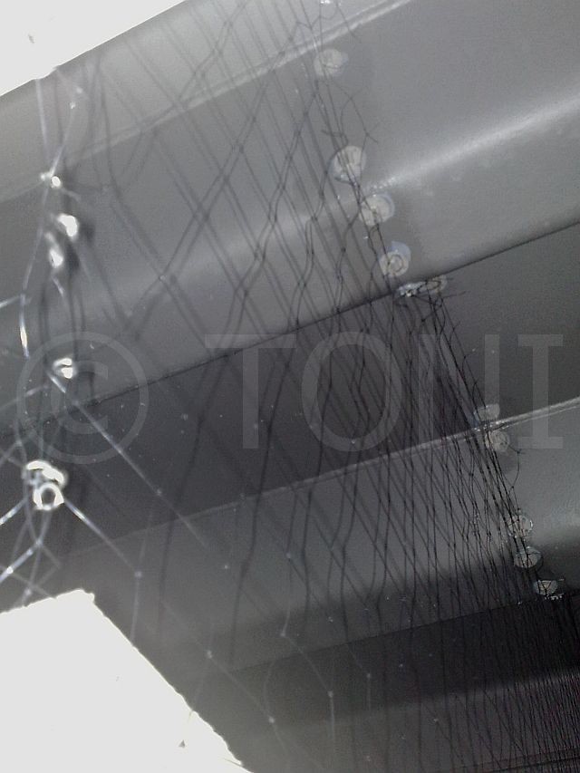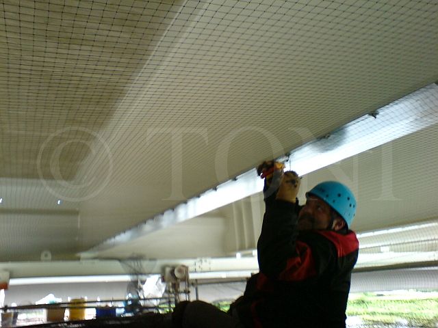 Zusammen mit einem kundeneigenen Montageteam haben wir mehr als 2.000 Quadratmeter PE-Netze Antec geklebt. Dazu wurden mehrere Tausend Halter mit Hochleistungskleber an Querverstrebungen der Halle angebracht. Nach ausreichender Aushärtezeit konnten die sehr leichten Netze problemlos in die Halter eingehangen werden. Ergebnis ist ein fast unsichtbares Netz.