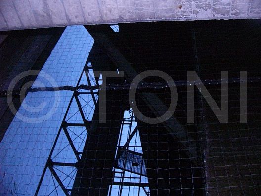 Die Unterseite der Stahlkonstruktion hat eine komplizierte Geometrie, weshalb ein Vogeleinflugschutz mit Gitterrosten oder Streckgittern sehr aufwendig geworden wäre. Unsere Netze in Klebetechnik eigneten sich hervorragend als Alternative, da sie grossflächig und günstig installiert werden konnten, ohne die Konstruktion durch Bohrungen zu beschädigen. So wurden weit mehr als 2.000 Quadratmeter PE-Netz in der Grösse 18mm x 18mm an der Stahlkonstruktion sowie am Widerlager klebend montiert. Gehalten wird das Netz von mehr als 5.000 Kunststoffhaltern, die mittels Spezialkleber an der Konstruktion befestigt sind.