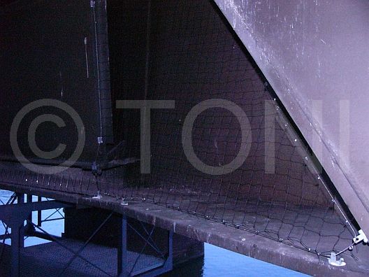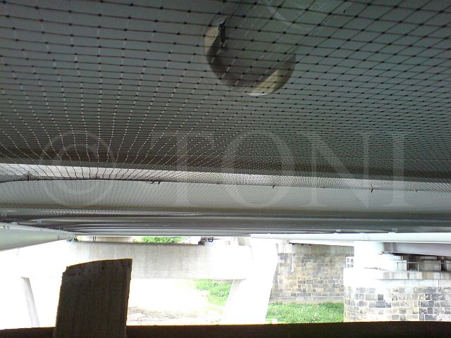 An dieser Brücke der Deutschen Bahn AG haben wir Auflagebänke der Brückenpfeiler mit PE-Netzen geschützt. Zu Wartungszwecken wurden die Netze mit Reissverschlüssen versehen, um den Zugang jederzeit zu ermöglichen.