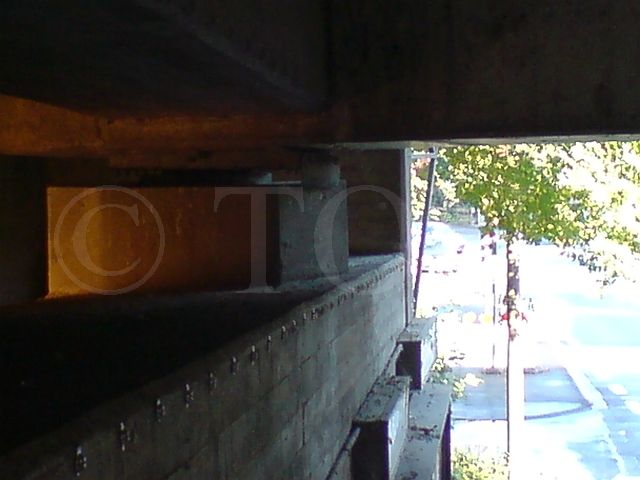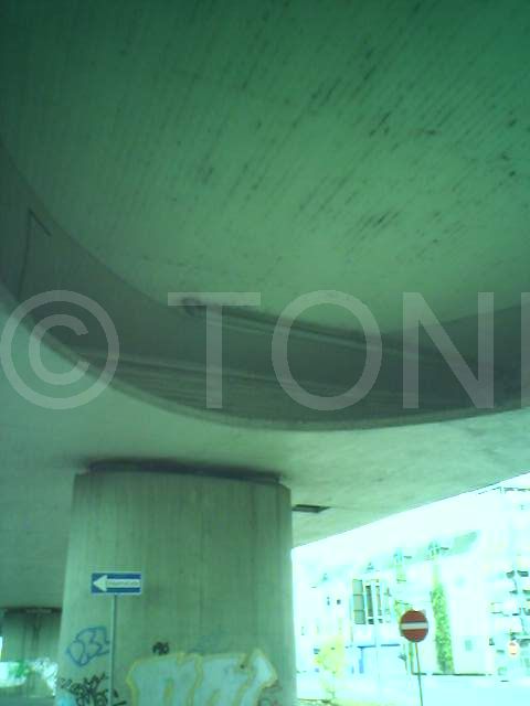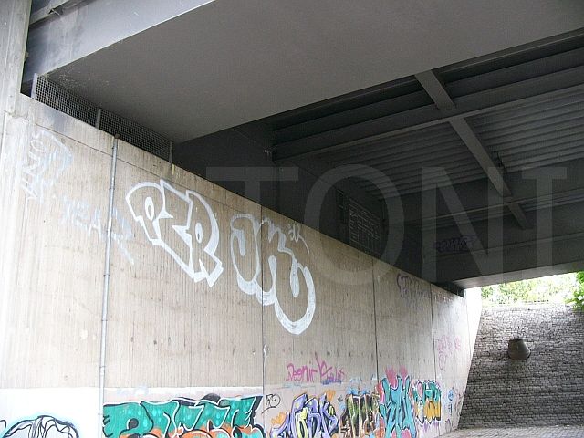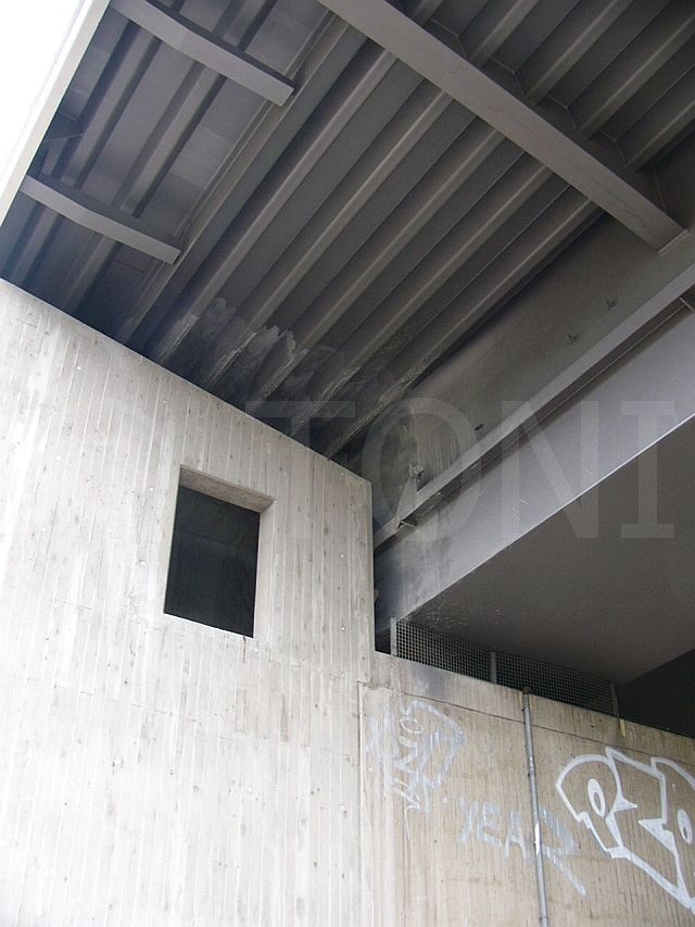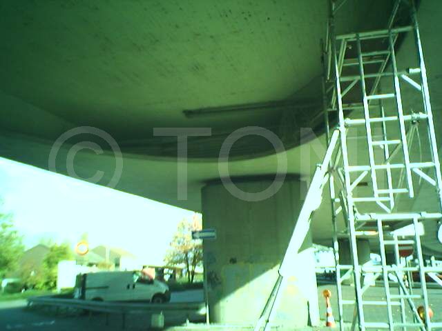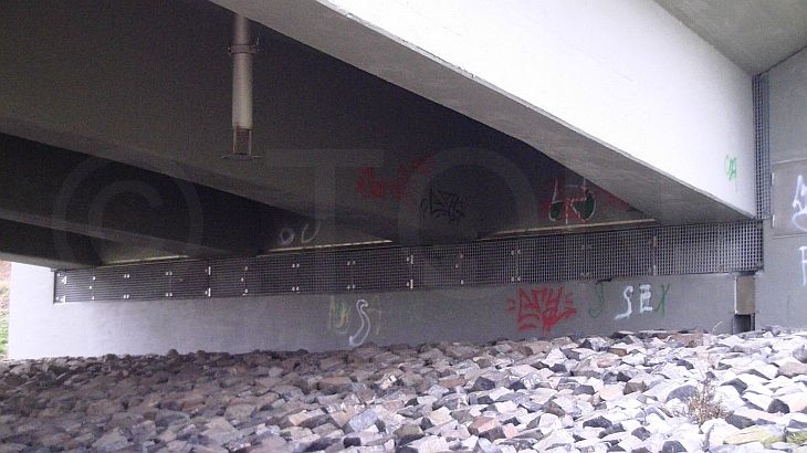 Die Einlässe am Widerlager dieser Brücke an der B57 in Duisburg wurden mit Polycarbonatplatten verschlossen. Es war nicht möglich, die Einlässe vollständig mit Platten zu verschliessen, so dass die noch offenen Bereiche mit Klebetechnik verschlossen wurden. Da die Tauben diese offenen Bereiche schnell herausfanden und die dahinter liegenden Widerlager schnell wieder besiedelten, war eine erneute Reinigung und Desinfektion notwendig.