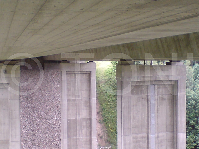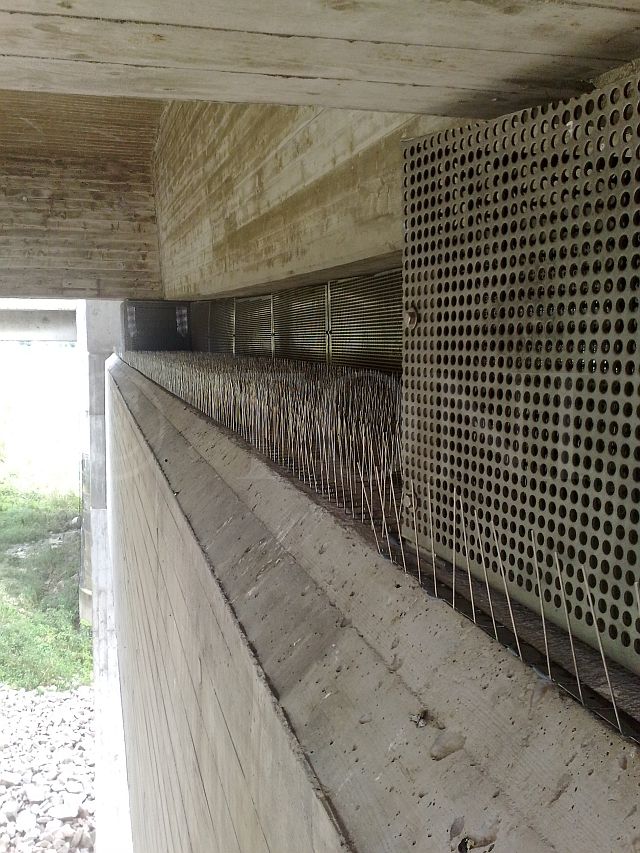 An dieser Brücke an der A59 in Duisburg ist das Widerlager mit Gitterrosten geschützt. Die Roste können aber nicht bis an die Unterkante der Brücke geführt werden und ermöglichen dadurch Tauben den Einschlupf.