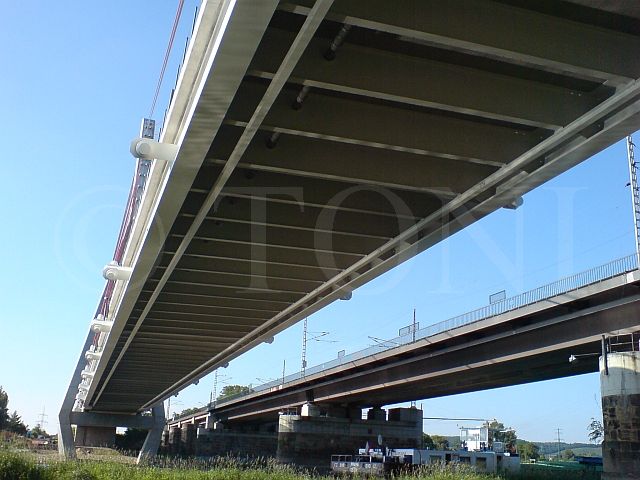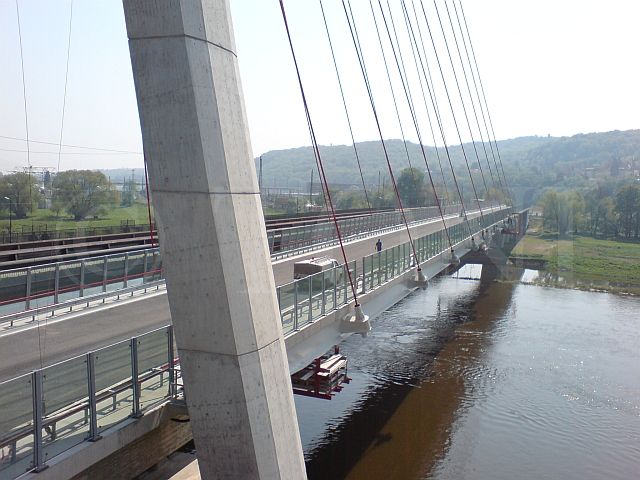 Die Niederwarthaer Brücke bei Dresden ist eine moderne Schrägseilbrücke mit einer Hauptöffnung von 192m. Die bereits bestehende, parallel geführte Eisenbahnbrücke ist massiv von Tauben befallen. Deshalb hat sich der Bauherr für umfangreiche Massnahmen zur Vogelabwehr entschieden.