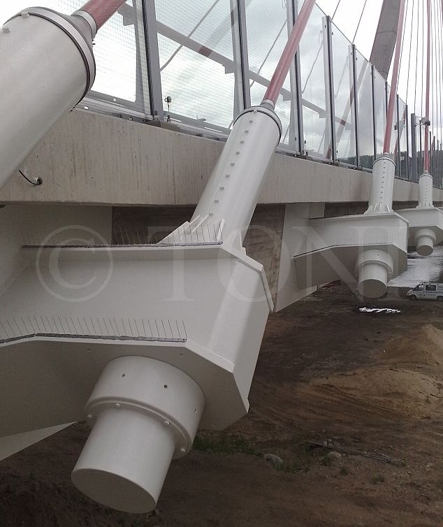 Die Seilverankerungen werden ebenfalls gern von Tauben besiedelt. Speziell abgespreitzte Edelstahlspikes verhindern dies. Die Edelstahlspikes wurden ebenso auf den Entwässerungsrohren, den Pfeileroberkanten sowie dem Pylon montiert.