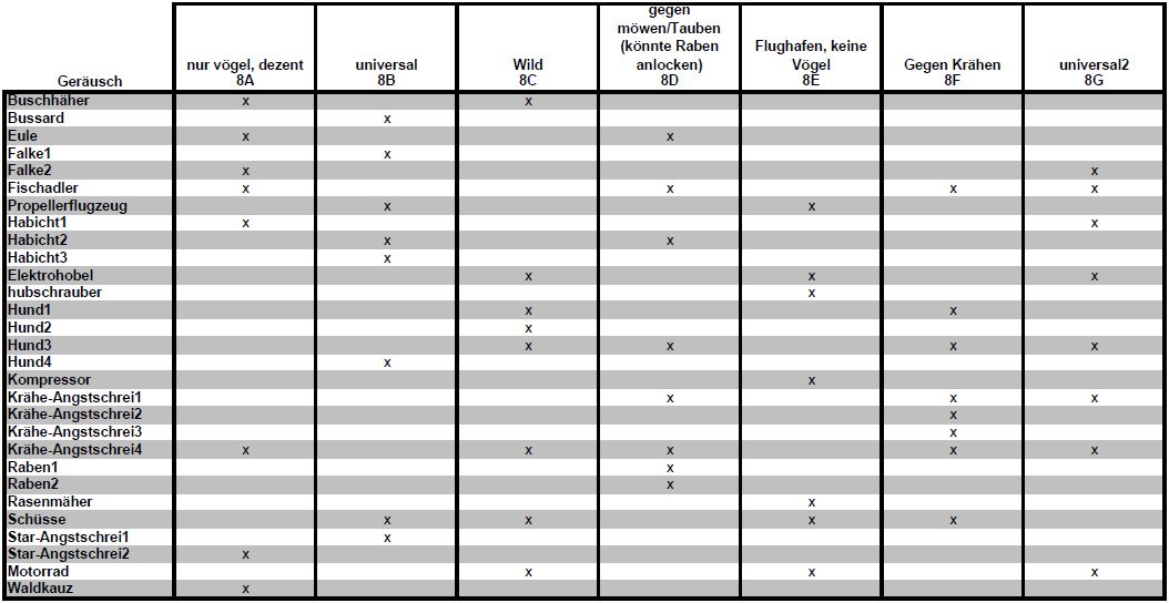 8B -wirkungsvoll, Vogel+Wildabwehrferne von Siedlungsgebieten (Habicht, Hundegebell, Angstschrei Star 1, Falke 1, Schüsse, Propeller-Flugzeug, Habicht (2), Bussard)