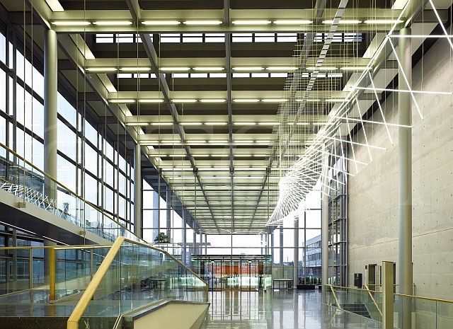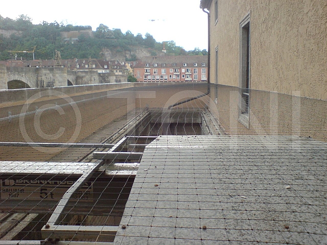 Netting was fixed over the forecourt of a hydroelectric power plant in Würzburg. The netting is hardly noticeable due to the choice of colour and mesh size.