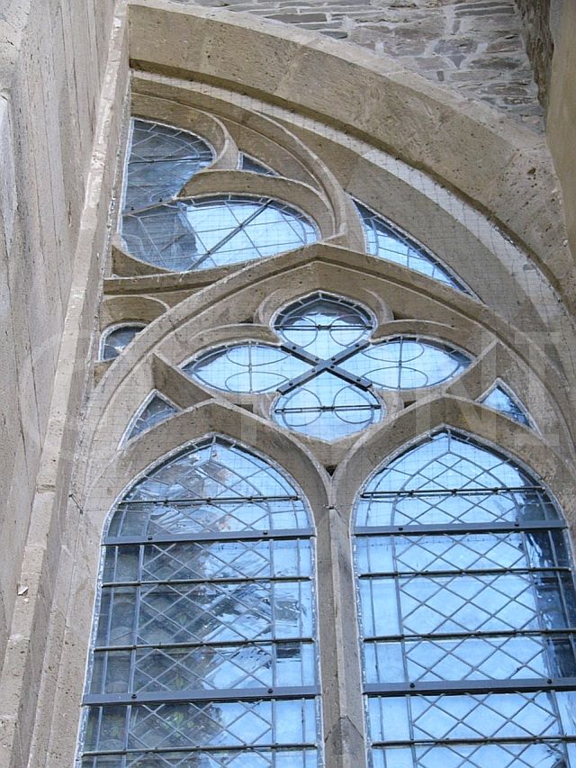 The Altenberg Cathedral of the Cistercians receives pigeon visits quite often. They like to sit on the overhanging ledges of the window ornaments, which is a common place for pigeons on churches - especially at wind-protected parts of the building.