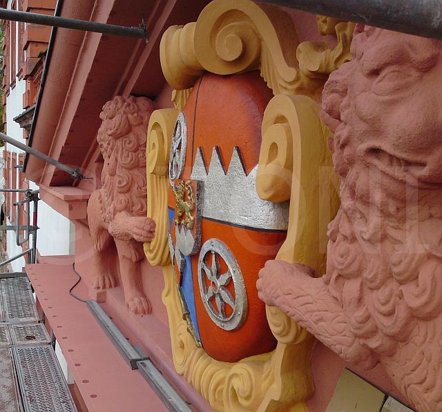 During the renovation of the Mainz fortress, the portal and emblem were recreated and freshly coated. As a bird control method, spikes had been used, which had to be taken off before renovating. The spikes turned out to be quite inefficient, since pigeons were breeding behind them.