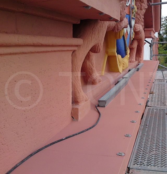 We have protected the ornaments with a netting of the upper part. The cross-bracings above that window had many pigeons too. There we have used a special pipe clamp wire system.
