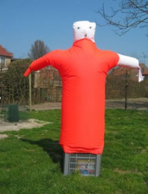 - The "straw man" consists of a 1.8m high and weather-proof puppet, a plastic base with an air pump, a sirene and a lamp. The scarecrow is automatically pumped regularly (standard is every 18 min), while emitting scaring sounds and flash lights (only with multi-use version).