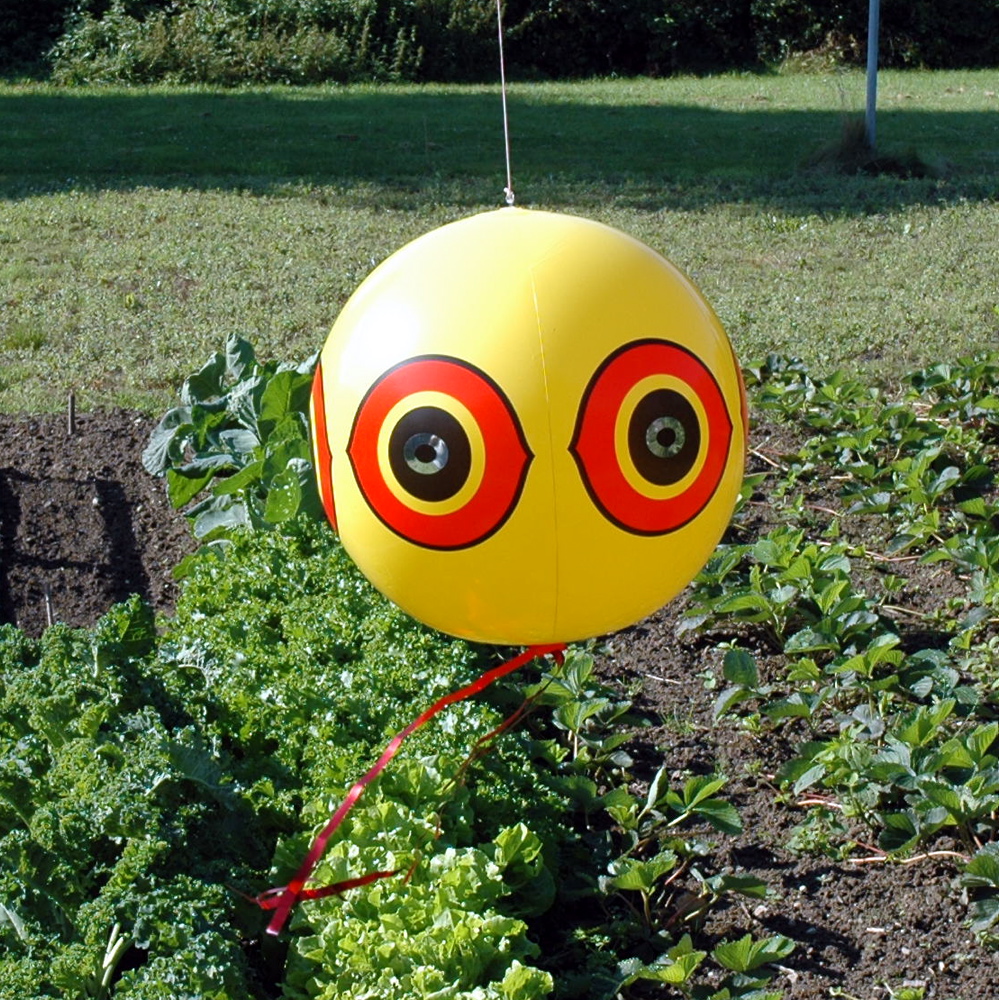 This printed vinyl balloon is suspended on a rod in or above the area to be protected. It can also be effectively used in small gardens or on individual fruit trees.