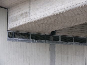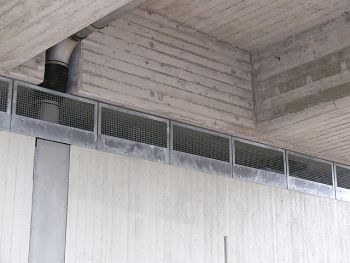 An dieser Brücke an der A59 in Duisburg ist das Widerlager mit Gitterrosten geschützt. Die Roste können aber nicht bis an die Unterkante der Brücke geführt werden und ermöglichen dadurch Tauben den Einschlupf.